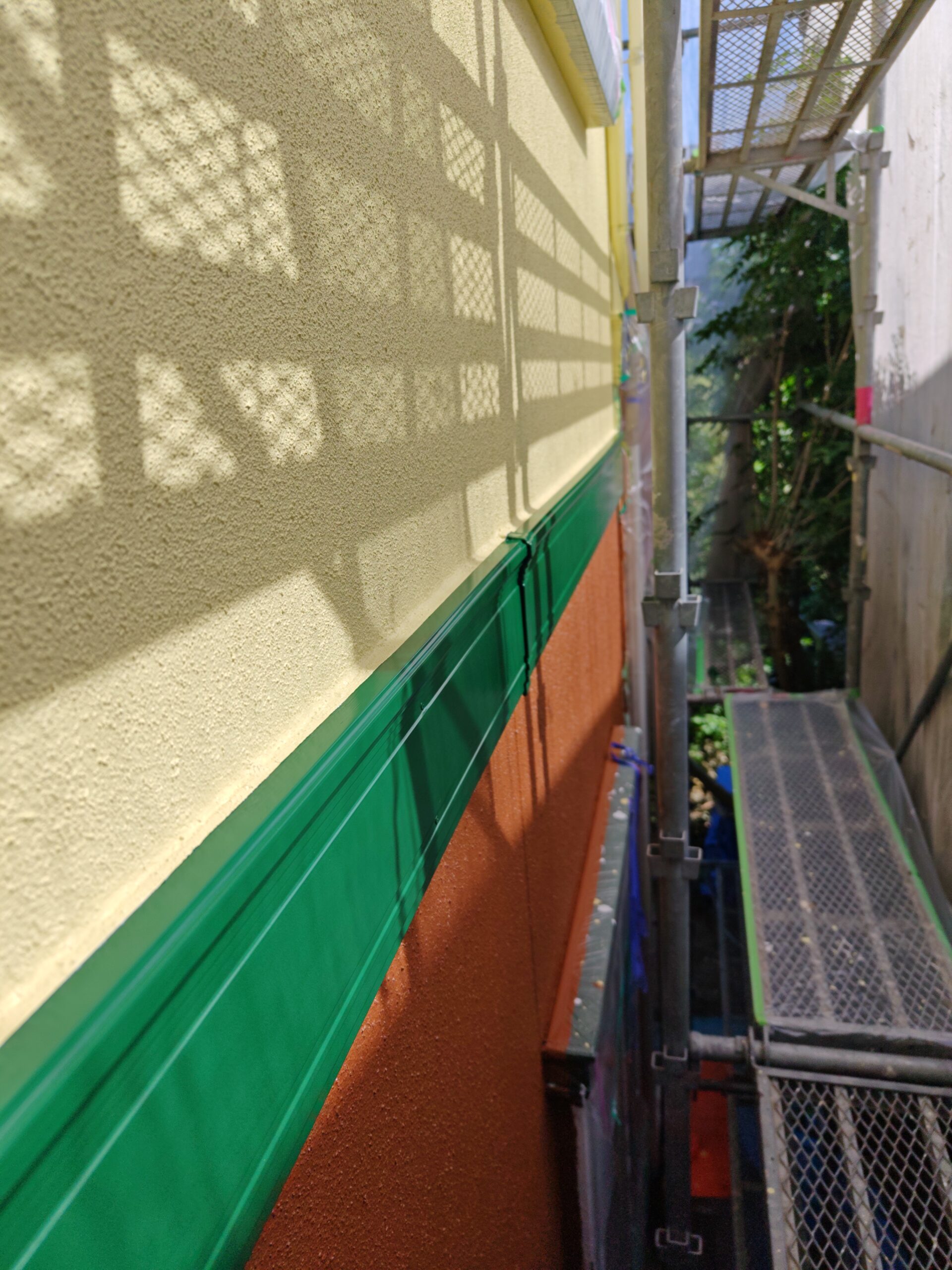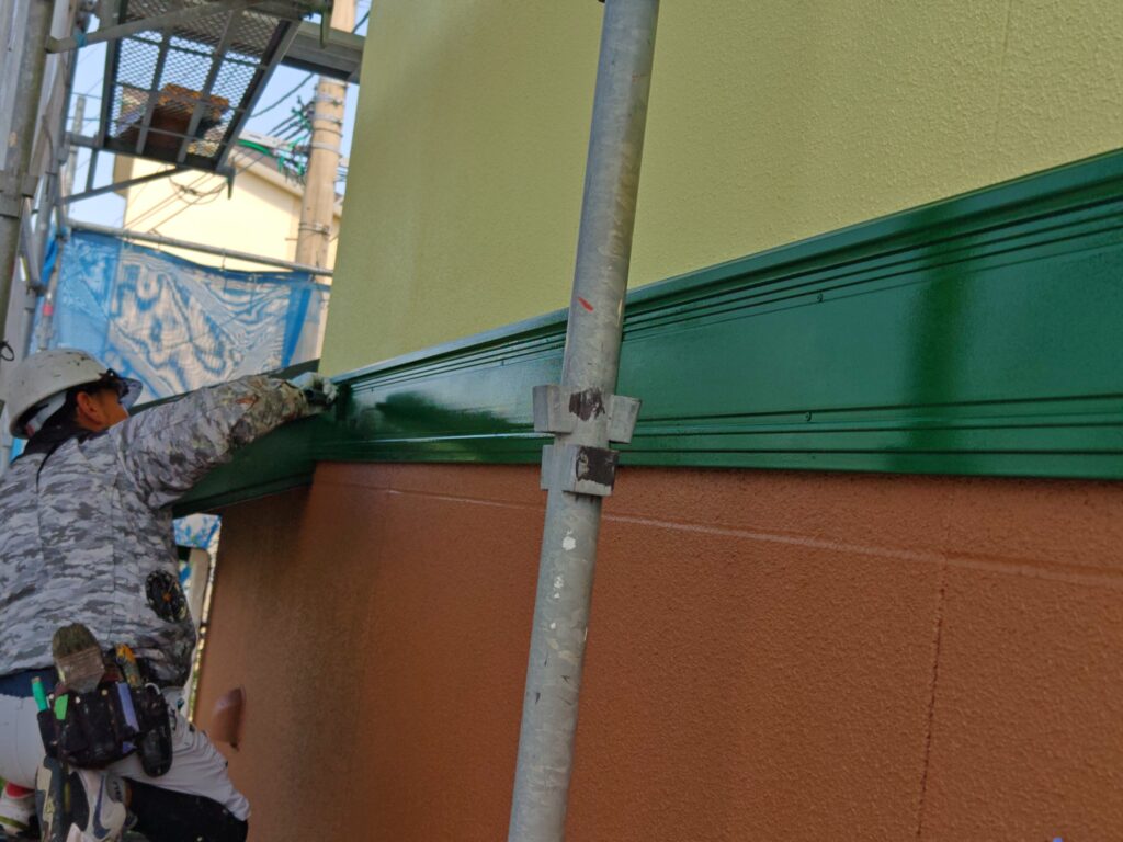 日置市伊集院町妙円寺 未分類250802153555999 2025.08.02 【外壁塗装の様子】まず、外壁の中央にある帯板(幕板)部分を鮮やかな緑色で塗装しました。この帯板がアクセントとなり、お家全体の印象がぐっと引き締まります。職人が丁寧に刷毛を使って、細部まで塗り残しのないように作業を進めています。